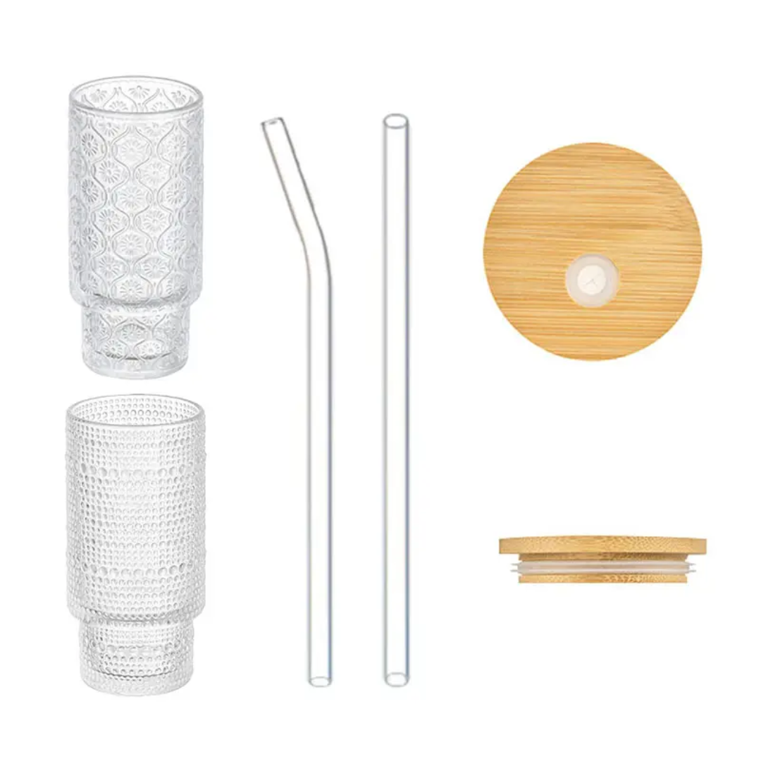 Embossed Vintage Glass Cup 320ml with Bamboo Lid, Straw, and Cleaning Brush - 320ml is backordered and will ship as soon as it is back in stock.