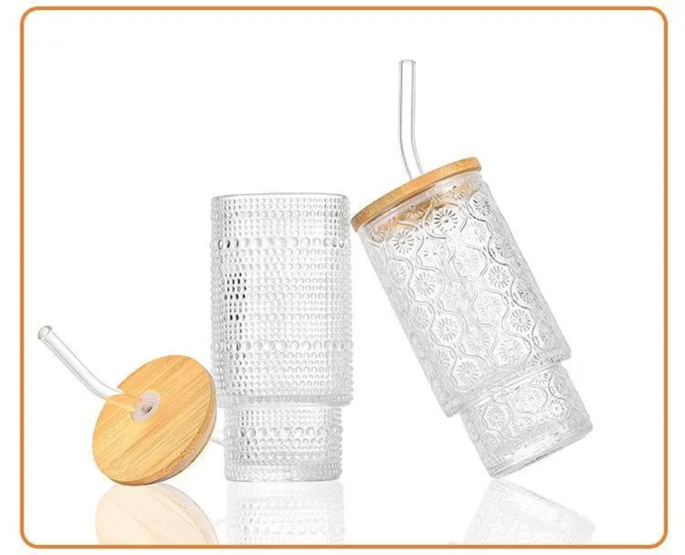 ● Material: High-quality embossed glass + bamboo lid + stainless steel or plastic straw (confirm if needed)