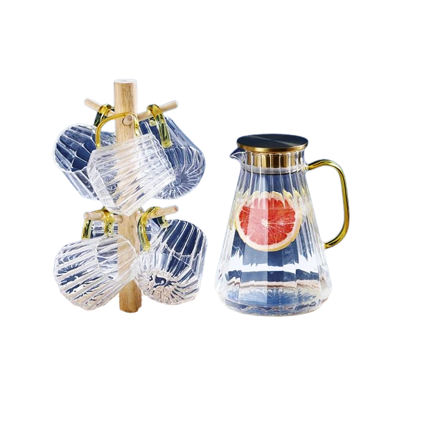 Elevate your beverage service with the Glass Decanter Kettle Cups Set. Crafted from high-quality glass, this elegant set features a large-capacity decanter designed for serving multiple beverages, complemented by beautifully designed cups for individual servings. The transparent glass showcases a stylish vertical stripe pattern, while the metallic gold finish on the handle and lid adds a luxurious touch. With a built-in filter at the spout, this decanter is perfect for infusions like lemon or tea, making it a versatile addition to your dining experience.