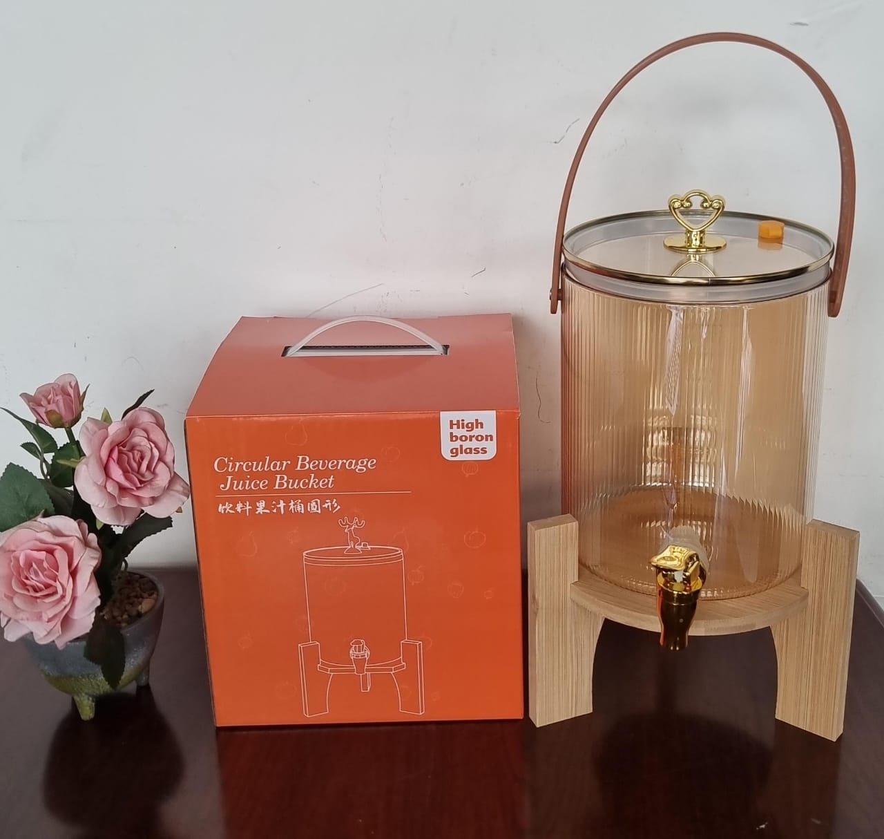 Serve drinks in style with this 3.6L golden borosilicate glass beverage dispenser. Complete with a bamboo base and glass lid, it combines durability with elegance, making it perfect for entertaining guests, family gatherings, or everyday refreshment at home.