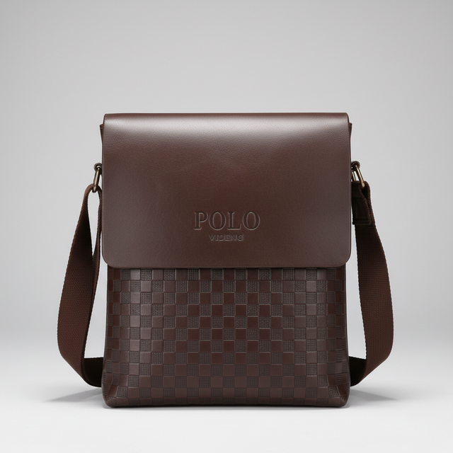 Polo Men's Crossbody Shoulder Bag Checkered Pattern PU Leather 26x3x20cm