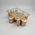 Transform your living room with this stunning glass-top coffee table featuring 4 matching puff stools and an elegant decorative border. This multifunctional furniture set is perfect for living rooms, lounges, and entertainment areas, offering both style and practical seating. The tempered glass top with ornate border design creates a luxurious centerpiece, while the 4 cylindrical puff stools tuck neatly underneath for space-saving storage. Available in three sophisticated color combinations: gold with beige puffs, puff brown with decorative red border, and puff grey with silver border.