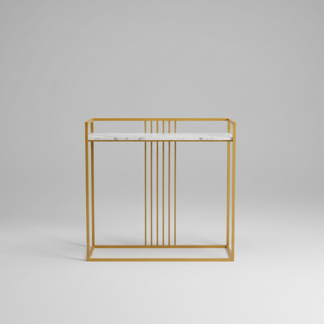 Add elegance to your entryway or living room with this modern console table featuring a sleek white marble-effect top and gold metal frame. Perfect for hallways, entryways, and living spaces, this contemporary table combines sophisticated style with practical functionality. The spacious white surface provides room for decorative items, keys, and essentials, while the geometric gold frame with vertical bar detail adds visual interest. Built with sturdy construction for daily use and easy-to-clean surface.